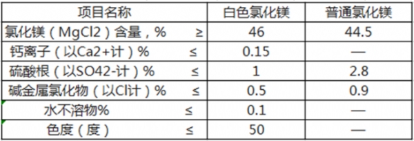 氯化鎂有工業(yè)級氯化鎂、食品級氯化鎂,根據(jù)含量有無水氯化鎂和46含量六水氯化鎂,外觀有氯化鎂粉末、鹵片、氯化鎂鹵精、氯化鎂塊、氯化鎂球,還有酸法工業(yè)生產(chǎn)的白片和大鍋熬法工藝生產(chǎn)的普片,普片還可分為凈片、通片和鹽片。